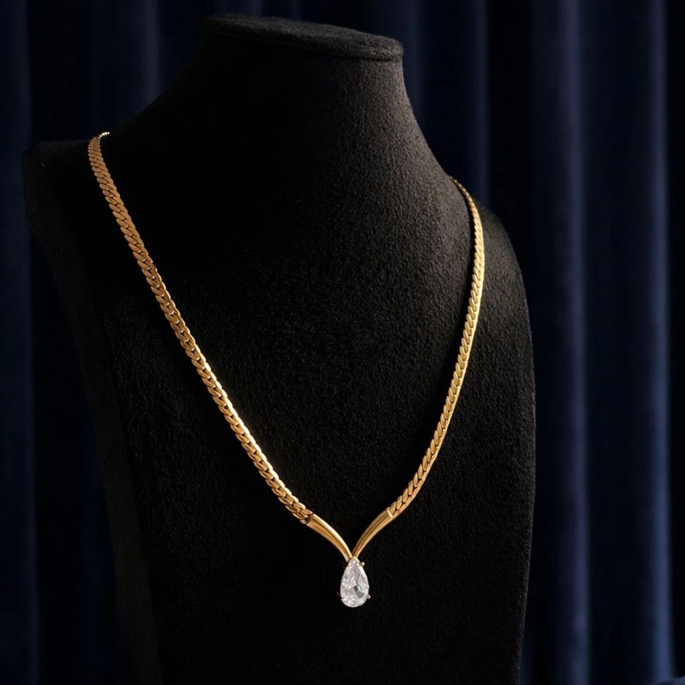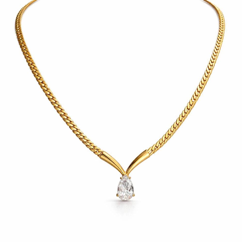 This elegant gold-tone necklace features a sleek, curved chain design that gracefully frames a teardrop-shaped stone at the centre. The polished finish and fluid silhouette create a modern statement while maintaining a minimal, sophisticated look. Designed to sit beautifully along the neckline, this piece captures light effortlessly, adding a subtle sparkle without overwhelming your style.