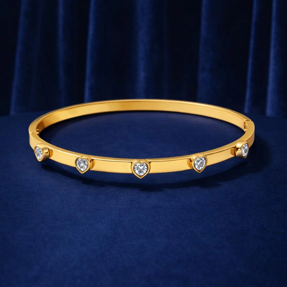 Designed for lovers of refined elegance, this gold bangle reflects the essence of minimal jewellery in Dubai. The sleek band is adorned with delicately set heart-shaped stones that add a soft sparkle while maintaining a clean, modern aesthetic. Its polished finish and understated design make it a versatile piece that complements both contemporary and traditional styles.