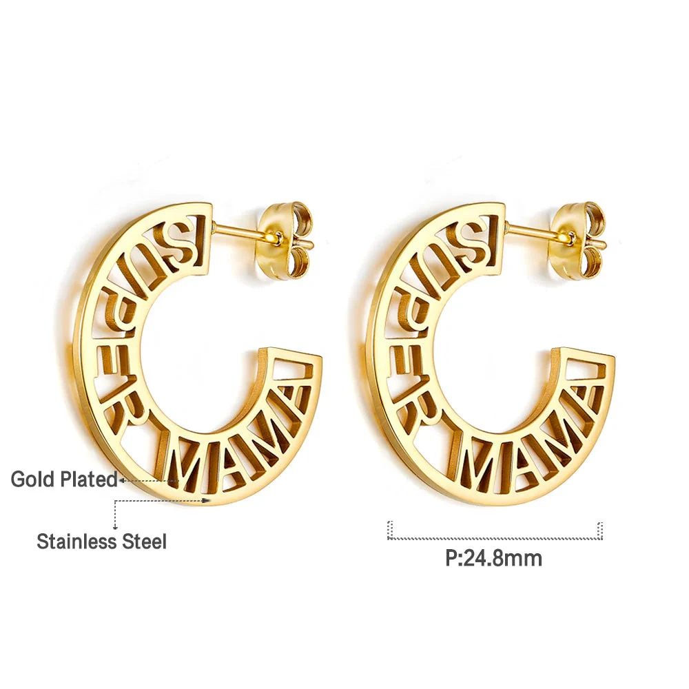 Celebrate the strength and love of every mother with our Super Mama Gold-Plated Hoop Earrings. Designed in a bold 24.8mm open-hoop silhouette, these statement earrings feature a unique cut-out “SUPER MAMA” typography that beautifully wraps around the curve. Crafted from high-quality stainless steel with a radiant gold-plated finish, they offer a luxurious shine while remaining lightweight and comfortable for all-day wear.