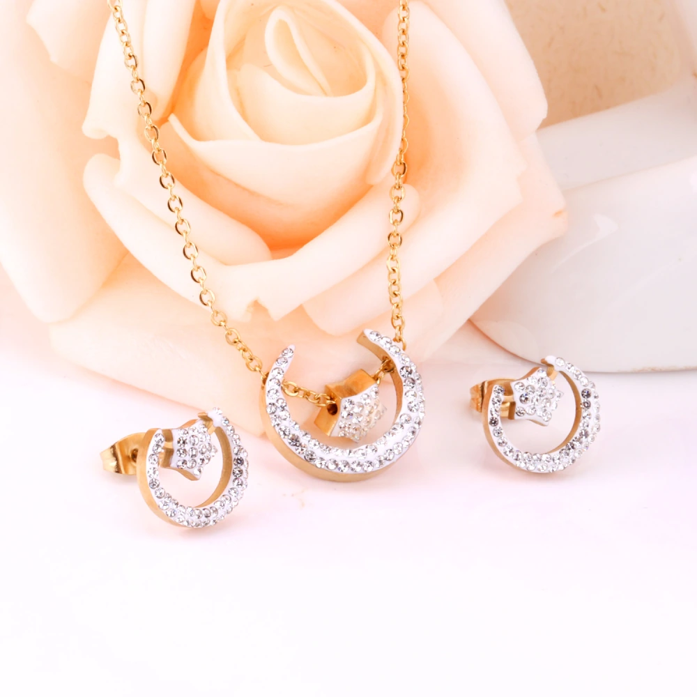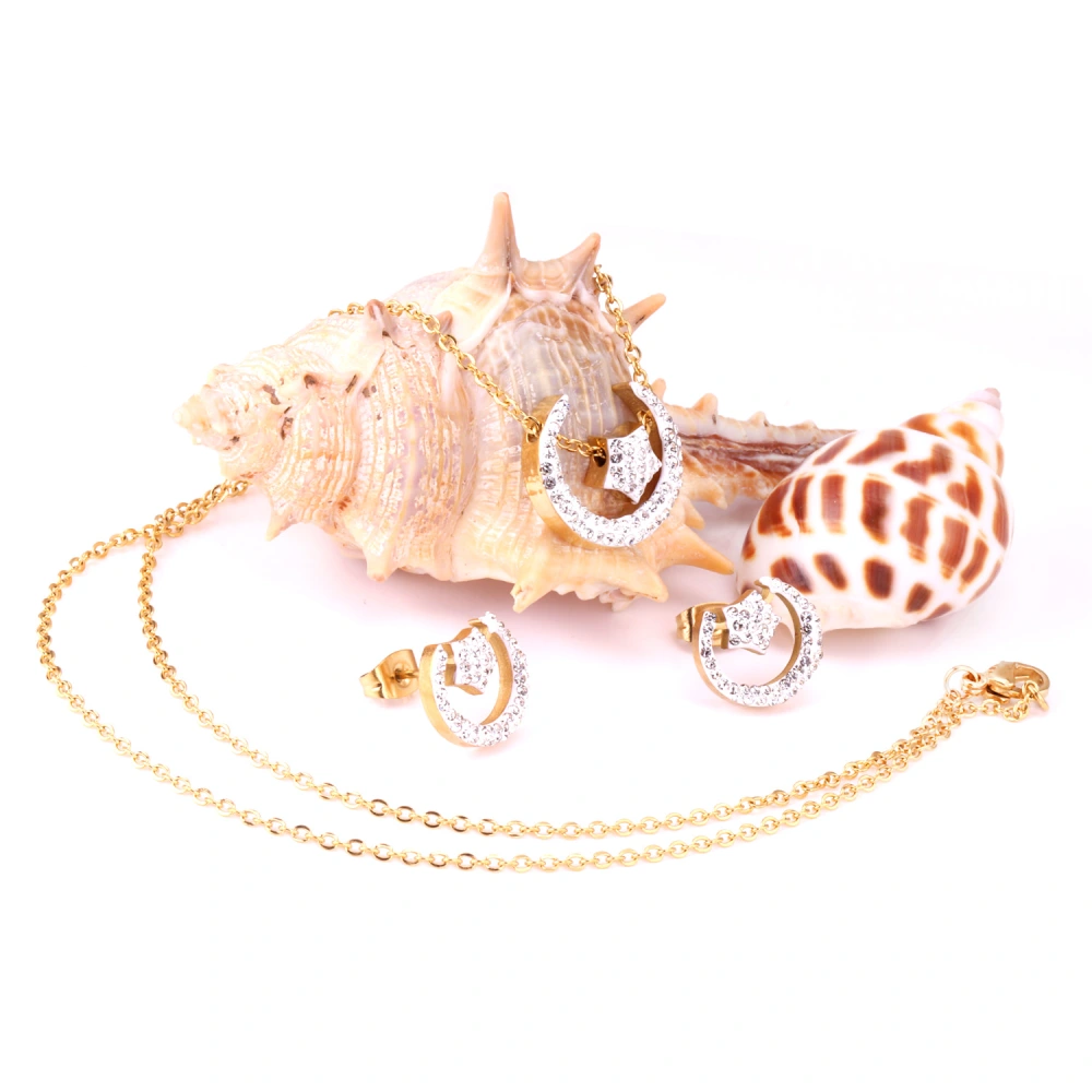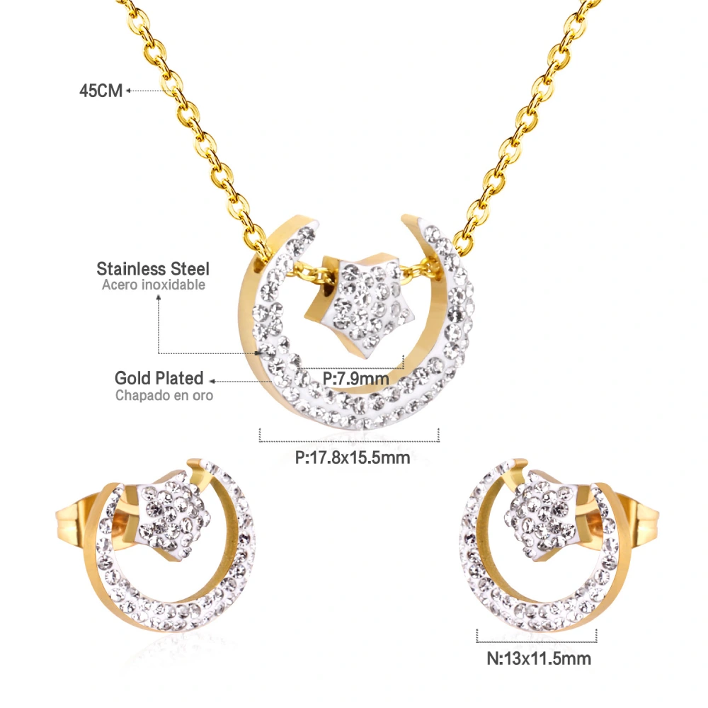 Add a touch of celestial elegance to your collection with this gold moon and star jewellery set, beautifully designed to shine with every movement. Featuring a delicate gold chain necklace with a crescent moon pendant adorned with shimmering stones and a dangling star charm, this set is perfectly paired with matching stud earrings for a coordinated, graceful look.