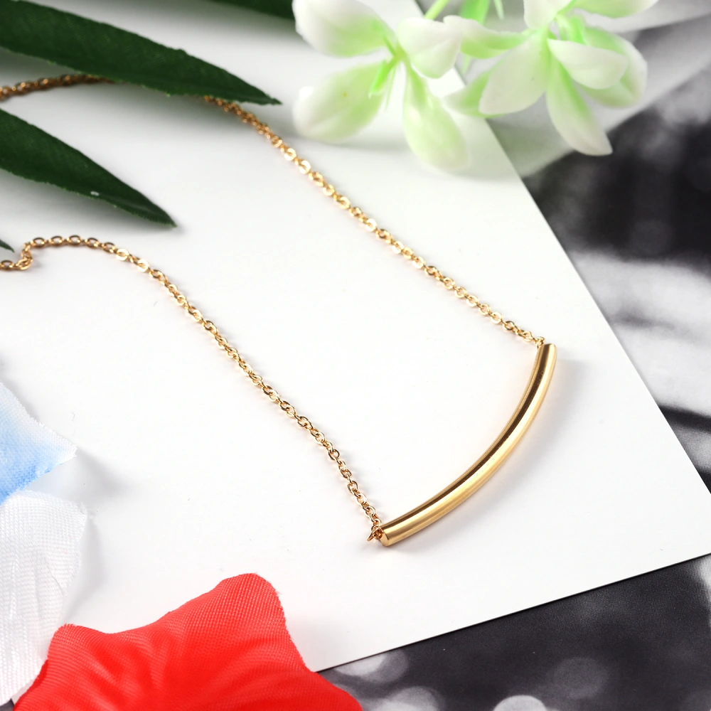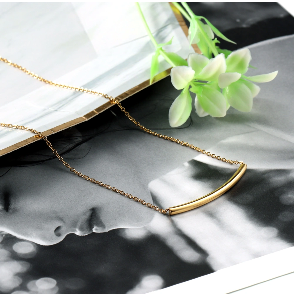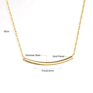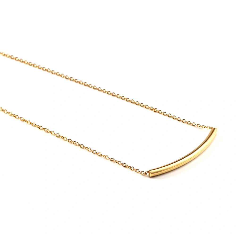 Add a touch of effortless luxury to your jewelry collection with this exquisite Gold Tube Bar Chain. The design centers on a sleek, horizontal curved bar that offers a smooth, fluid aesthetic, bridging the gap between classic elegance and contemporary trend. The rich gold tone provides a warm glow against the skin, while the fine chain ensures the piece feels weightless and comfortable for all-day wear.