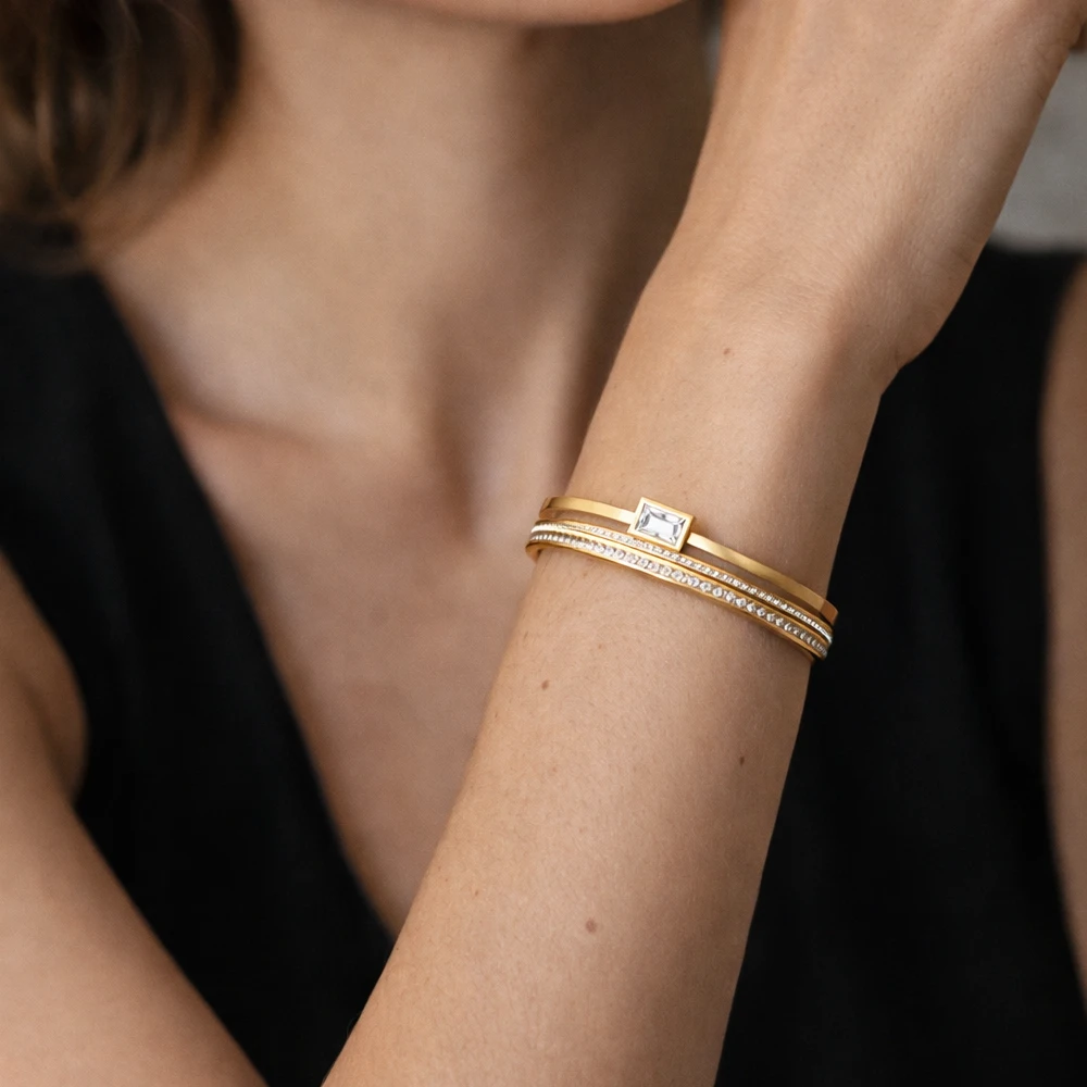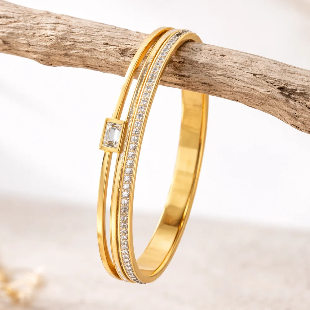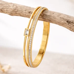 This minimal gold statement bangle is a perfect expression of modern luxury and refined craftsmanship. Designed with a sleek double-band structure, the bangle features a rectangular emerald-cut stone at the center, beautifully complemented by a delicate line of pavé-set stones that enhance its brilliance. Crafted in polished yellow gold, this bangle reflects understated elegance, making it ideal for everyday wear as well as special occasions. Its clean lines and balanced proportions highlight fine detailing without overpowering the design.