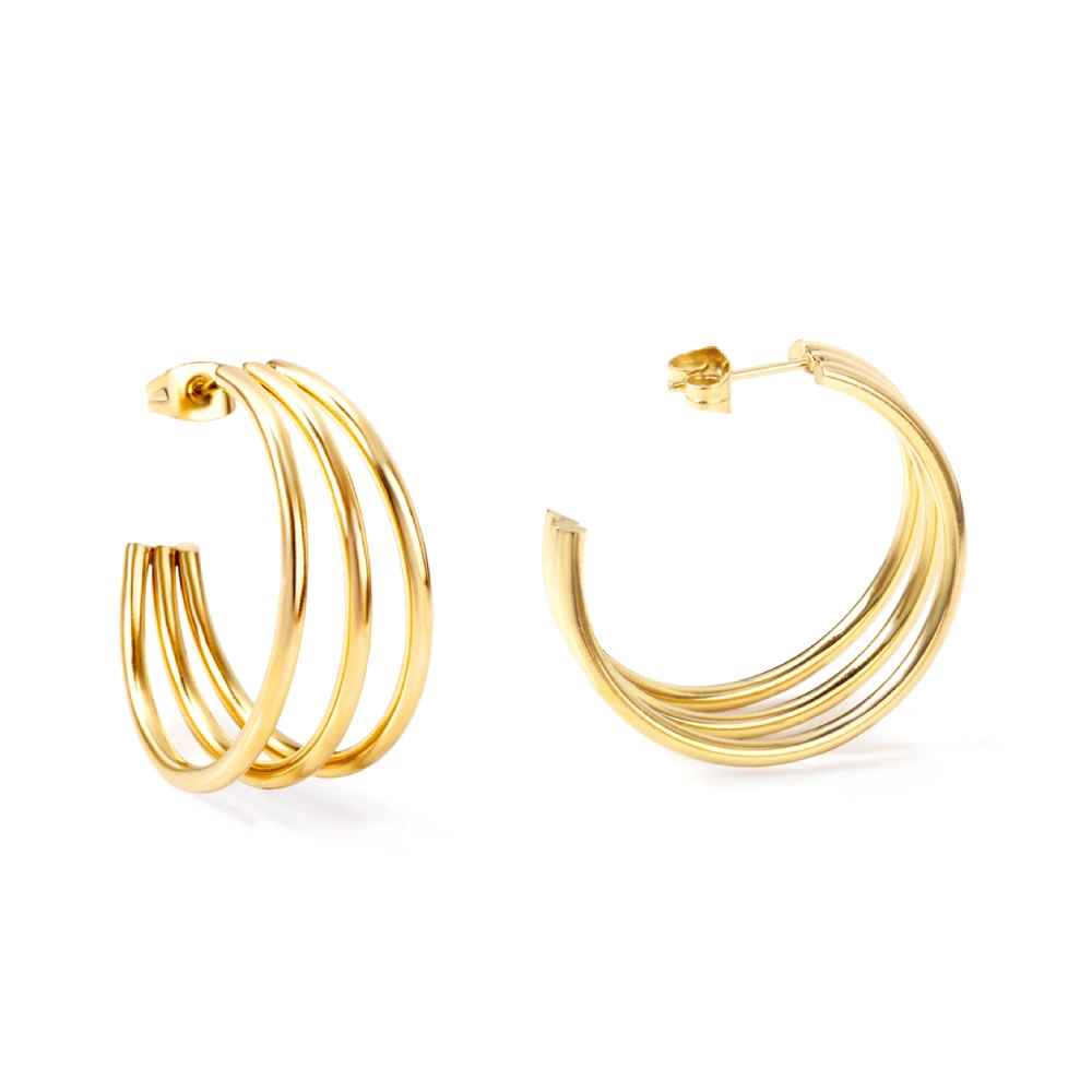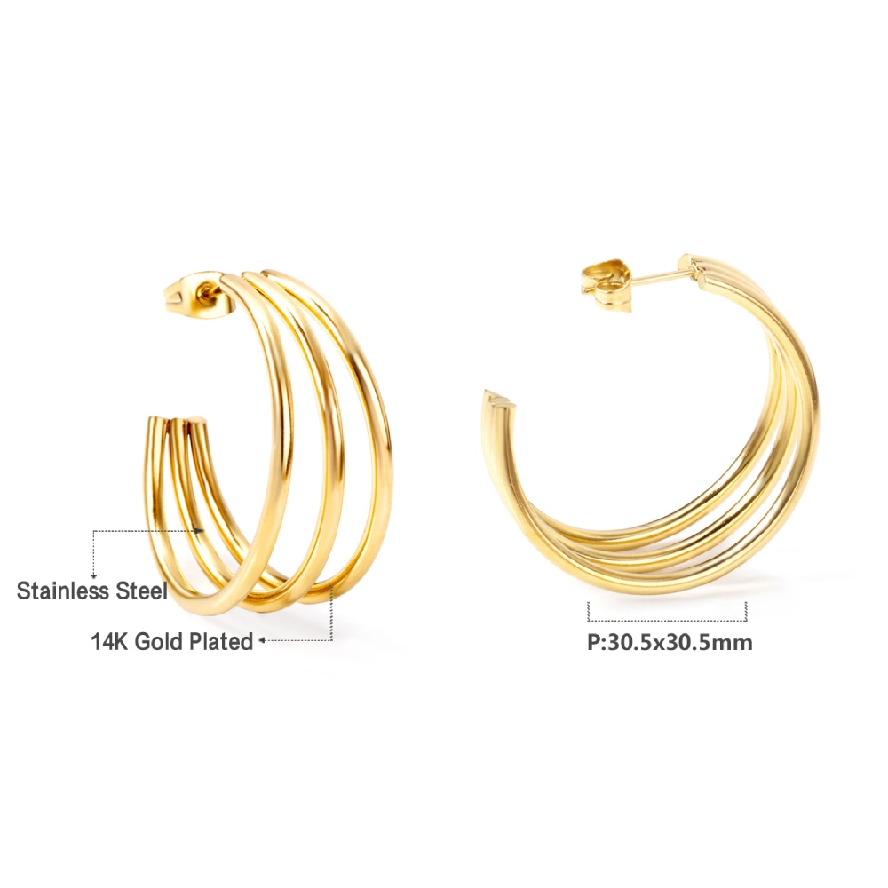 Make a bold yet refined statement with these multi-layer gold hoop earrings, designed to elevate your everyday look. Featuring a sleek triple-band silhouette in a radiant gold finish, these hoops create a stacked effect in one effortless piece. The smooth curves and polished shine bring a modern, luxurious touch that pairs beautifully with both casual and dressy outfits.